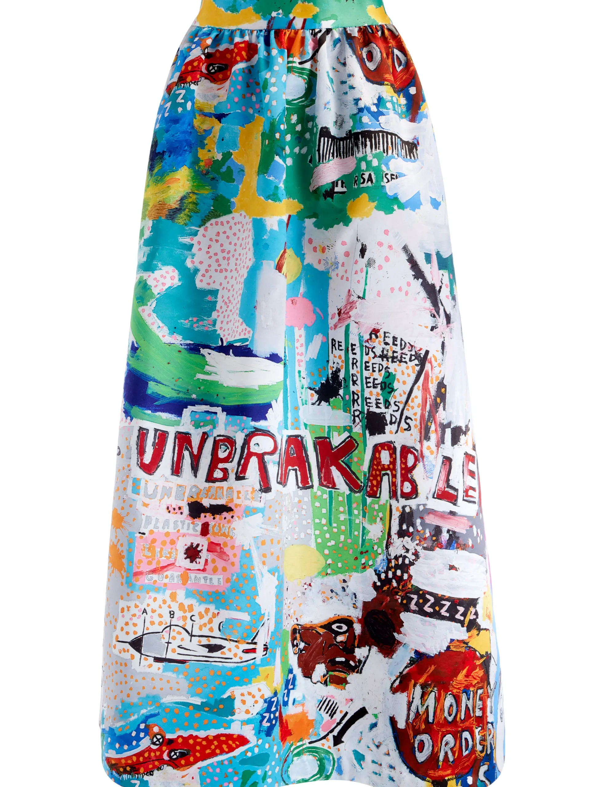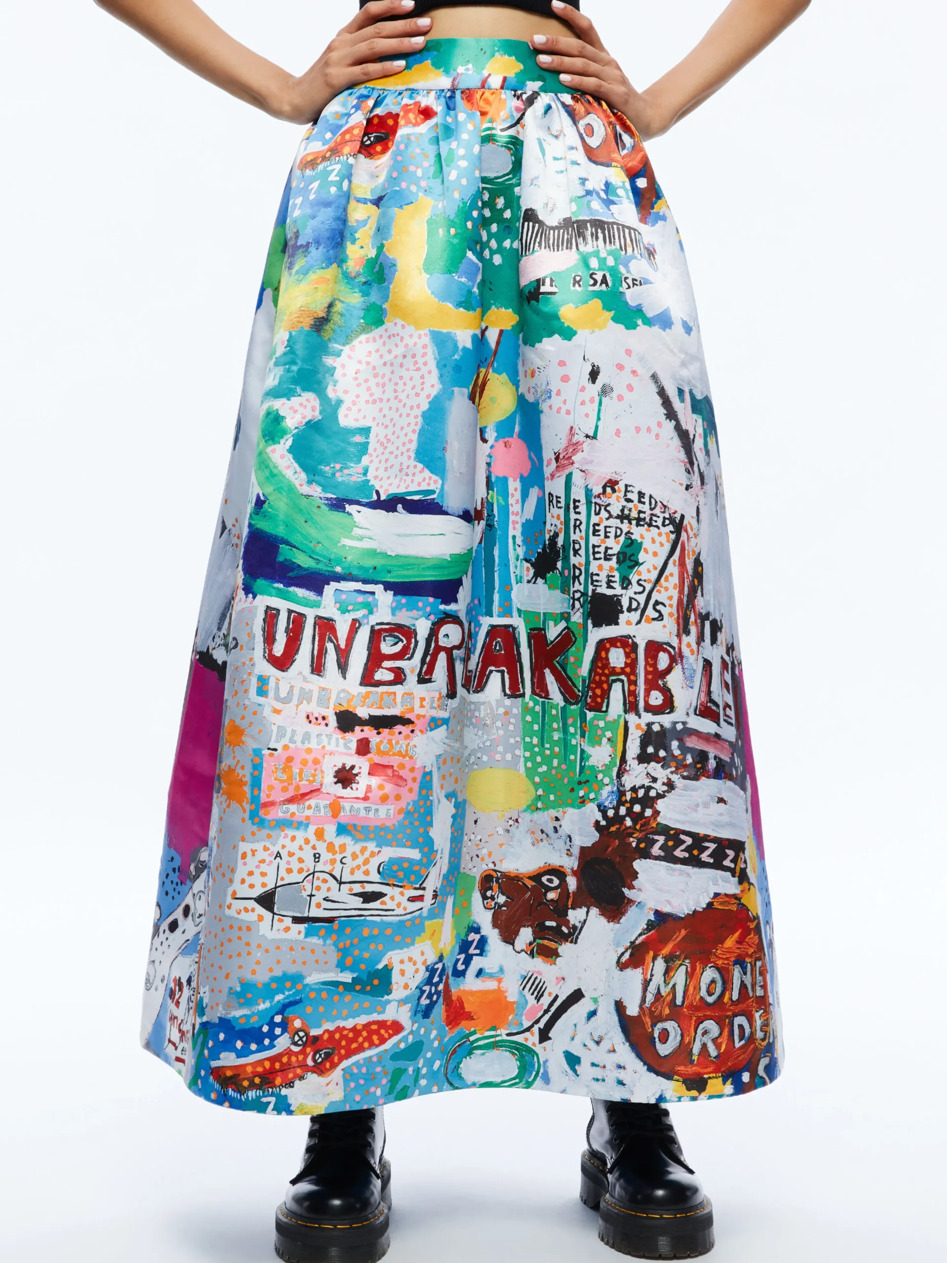 This gorgeous ankle length skirt includes so many details that make it extra-special. In effect: the wearable artwork print, extra flared skirt, elastic waistband and a high waist.Basquiat crafted Unbreakable by skillfully blending his signature elements – words, images, and vibrant colors.