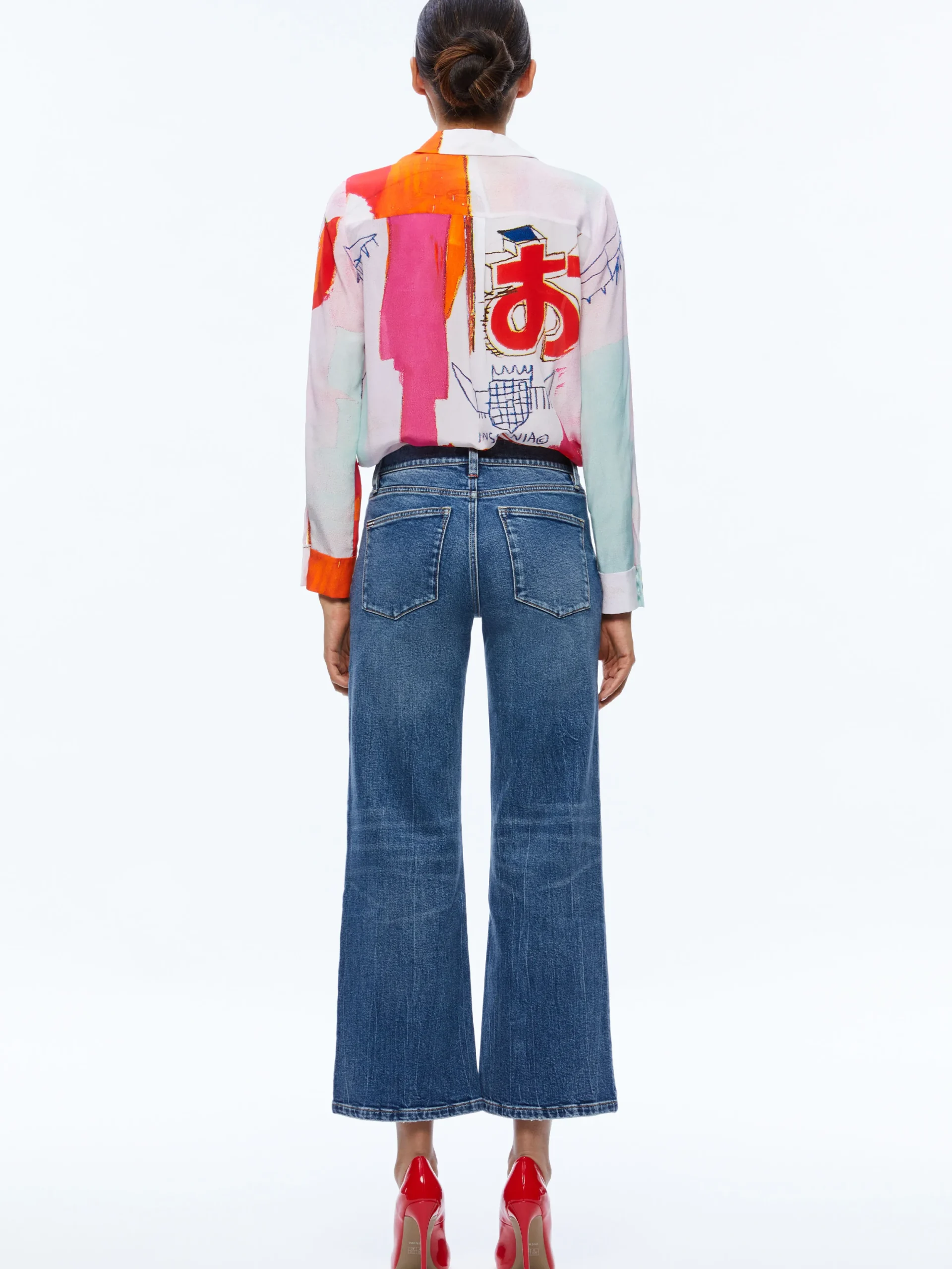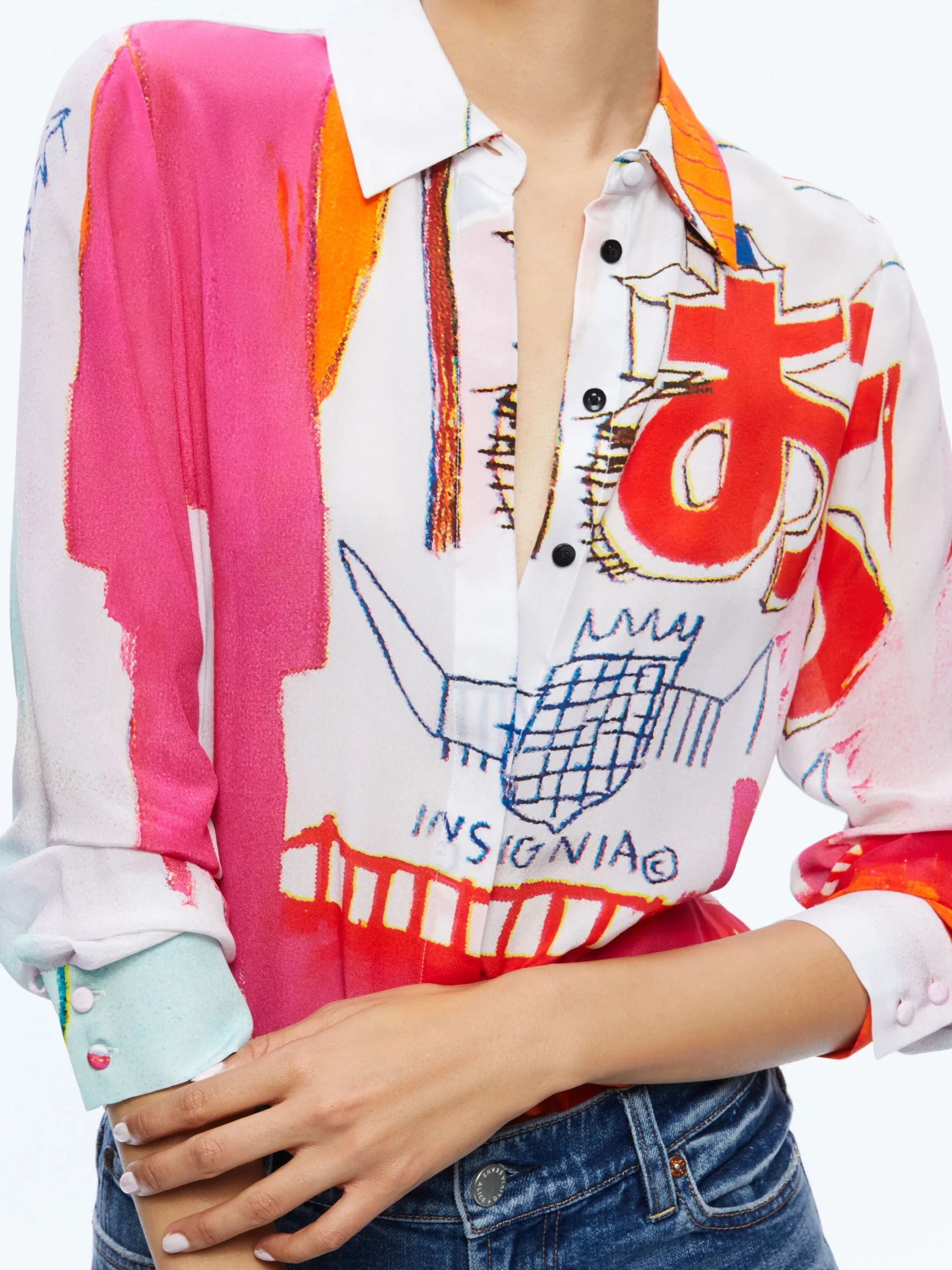 Our classic Willa button-down in a 100% silk print that is a wearable work of art. Basquiat crafted Insignia by skillfully blending his signature elements – words, images, and vibrant colors.alice + olivia celebrates and finds inspiration in the works of late artist Jean-Michel Basquiat, creating an avant-garde capsule to amplify his voice and creativity and to inspire the future of young rising artists.