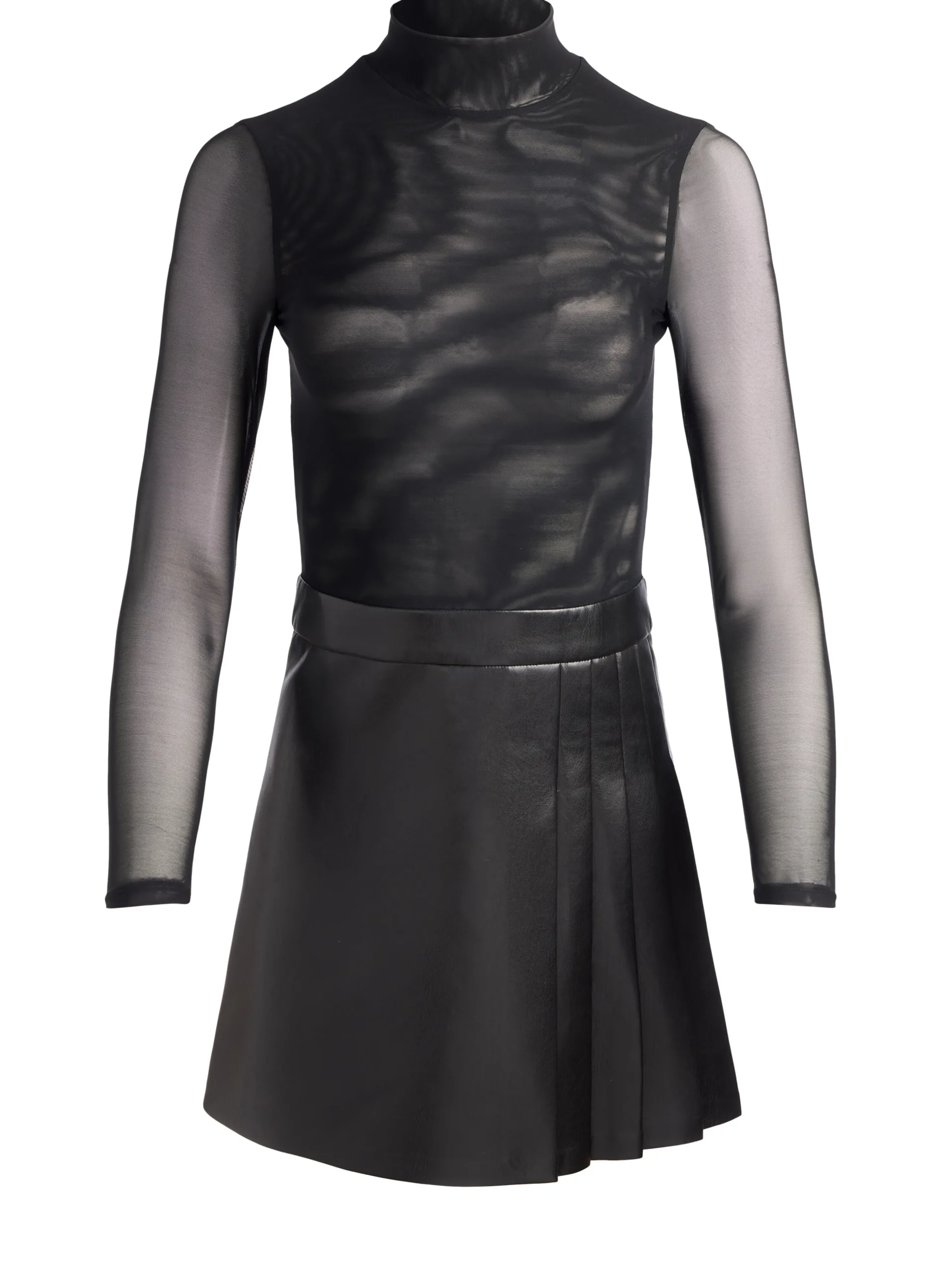 DescriptionThis long sleeve mini features a crewneck, mesh bodice, and a vegan leather skirt. We love it for anything fr…