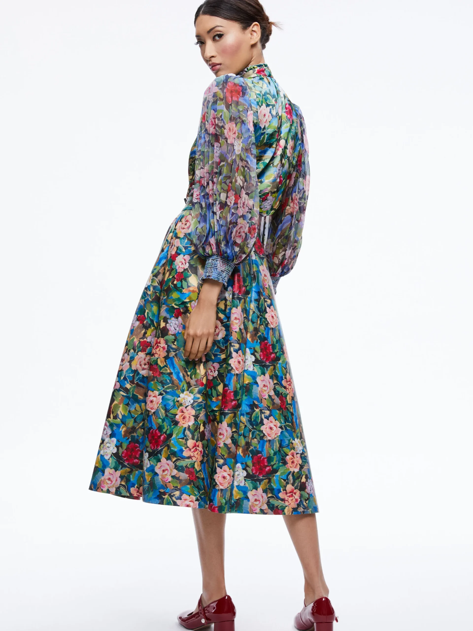 Alice and Olivia ILAN SMOCKED SLEEVE BUTTON FRONT BLOUSE BREEZE FLORAL SM*CLOTHING