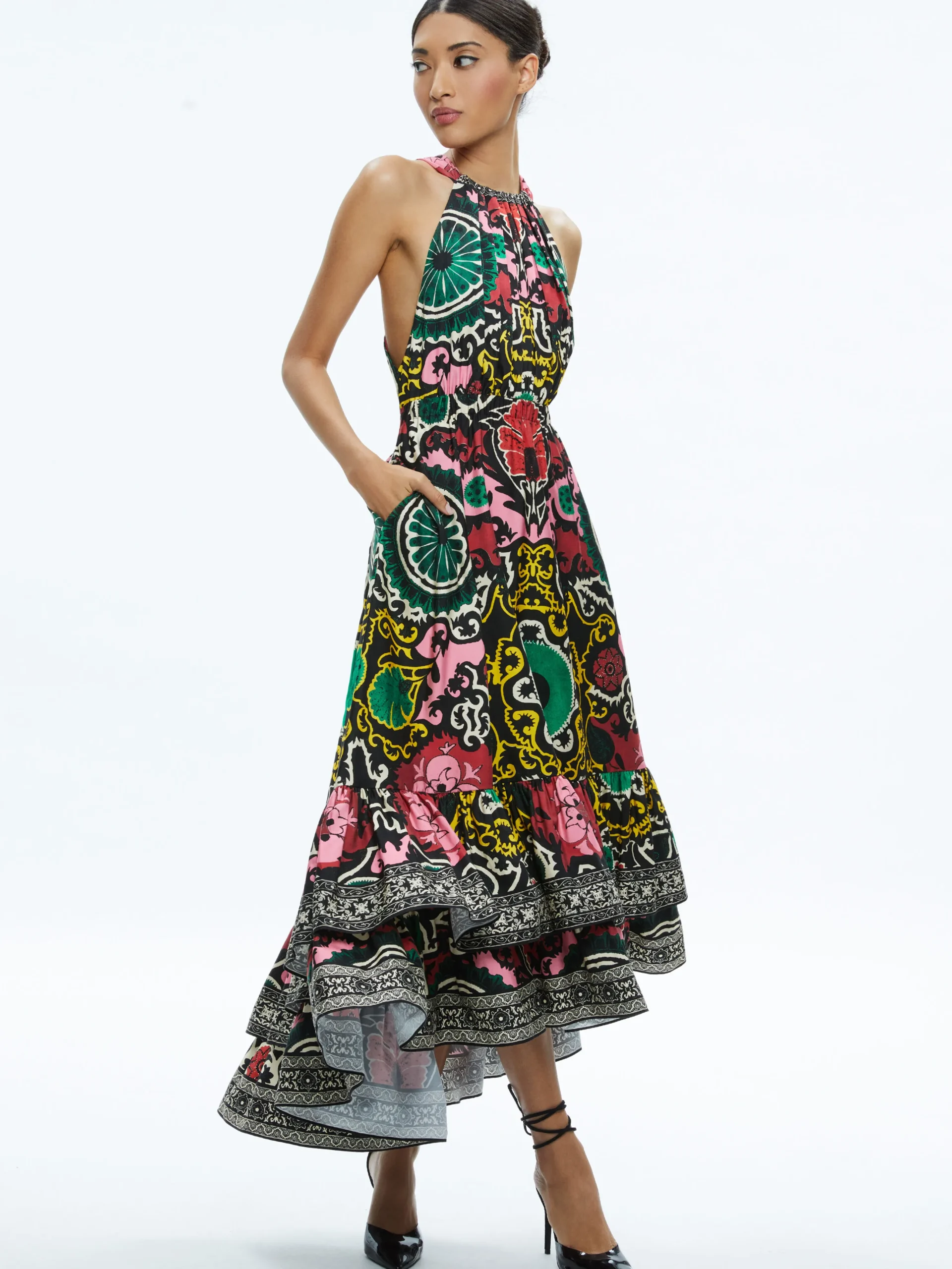 Alice and Olivia LOYCE TWIST BACK RUFFLE MAXI DRESS MONARCH BLACK MEDIUM*DRESSES | DRESSES | CLOTHING