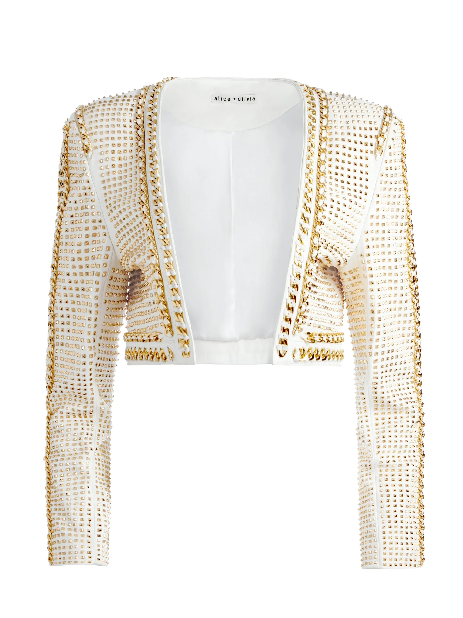 Oh, how we love a cropped jacket moment! This leather number includes studded embellishments and chain trim.