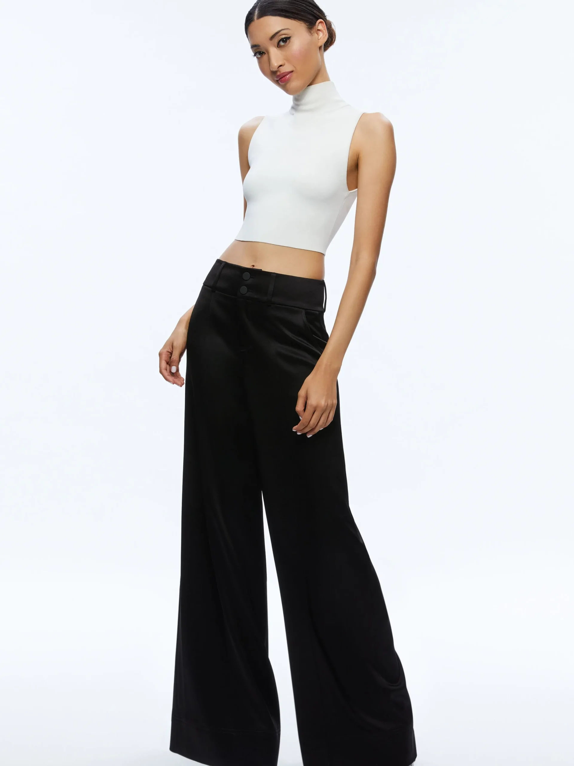 DescriptionHigh rise. Wide leg. Satin finish. There are so many things to love about this pant! But mostly how flatterin…
