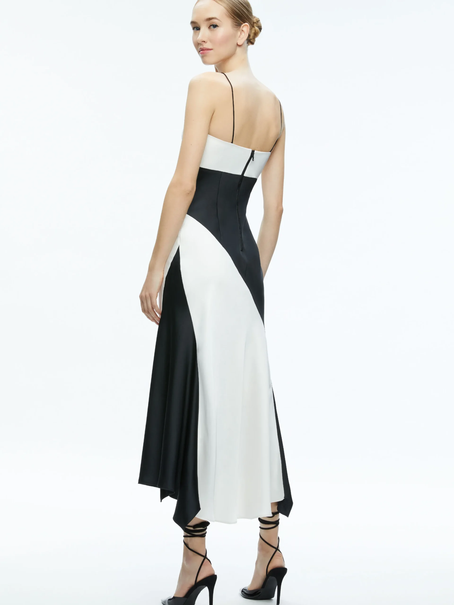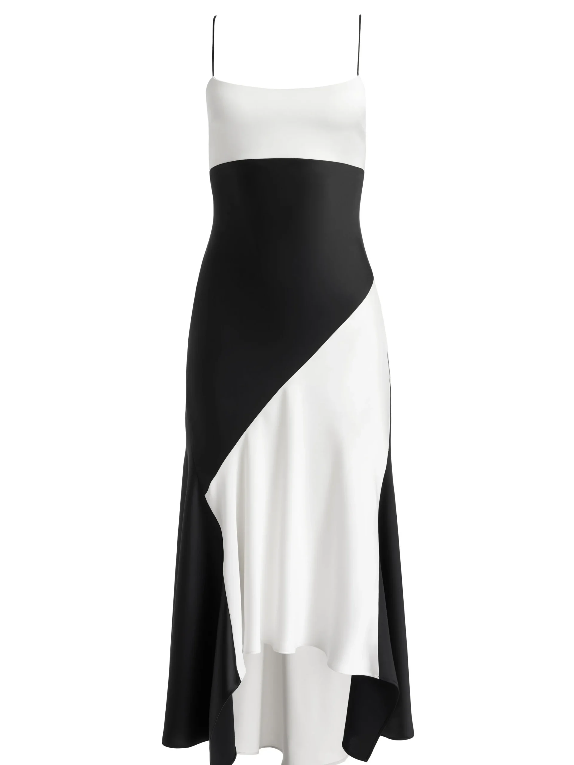 You’re looking at a romantic slip dress that hits mid shin with a dramatic handkerchief hem. We love the graphic mix of black and white, the satin finish and the fabric that moves in such a beautiful way (and that includes a hint of stretch for a flattering and comfortable fit).