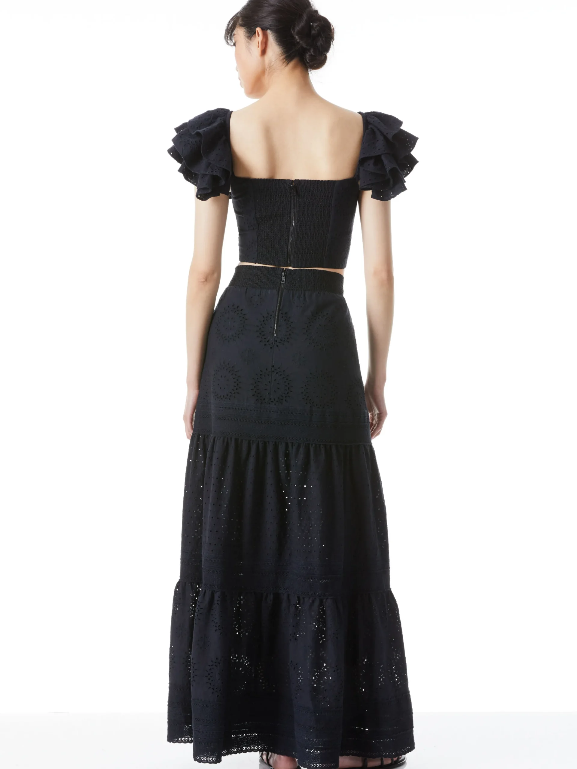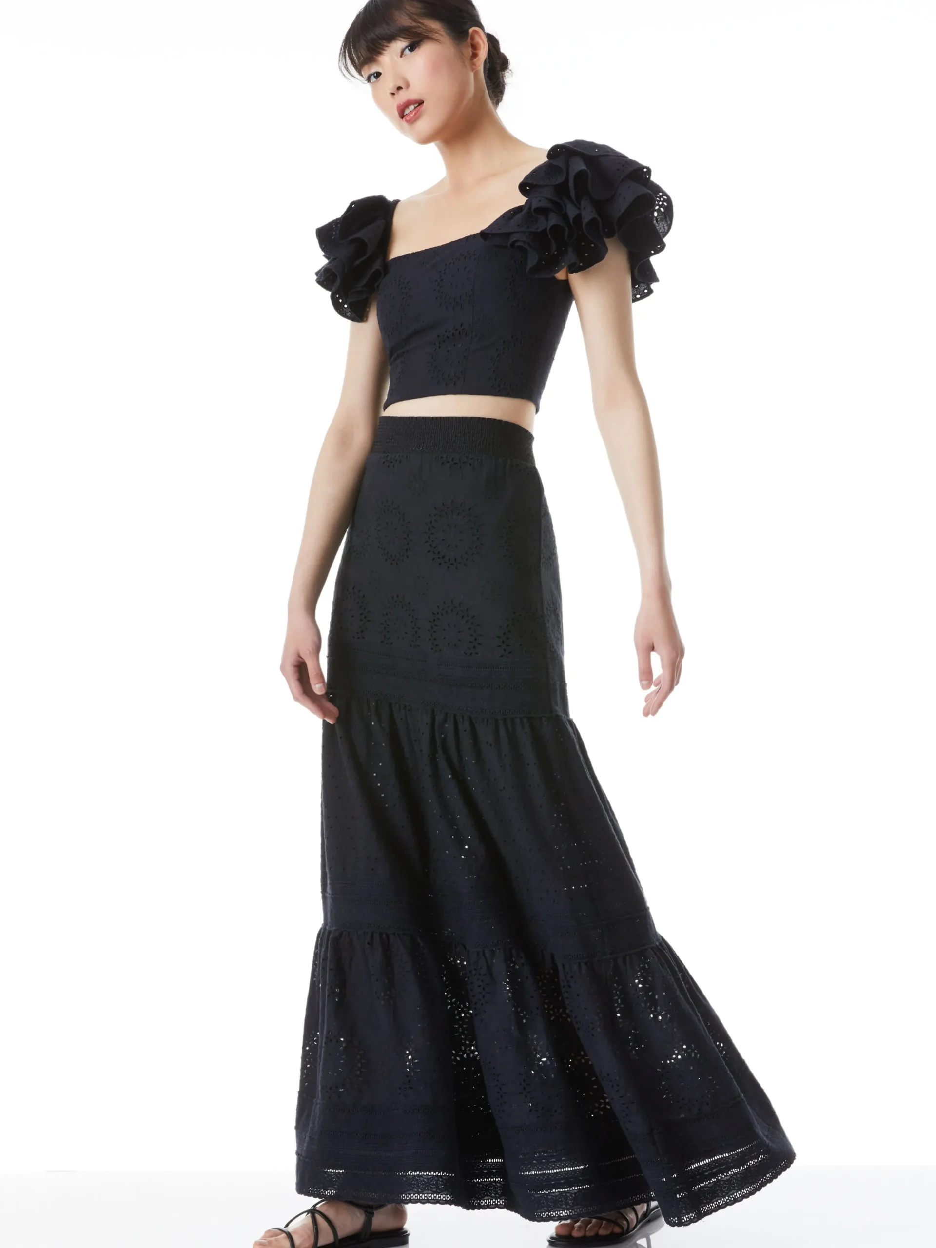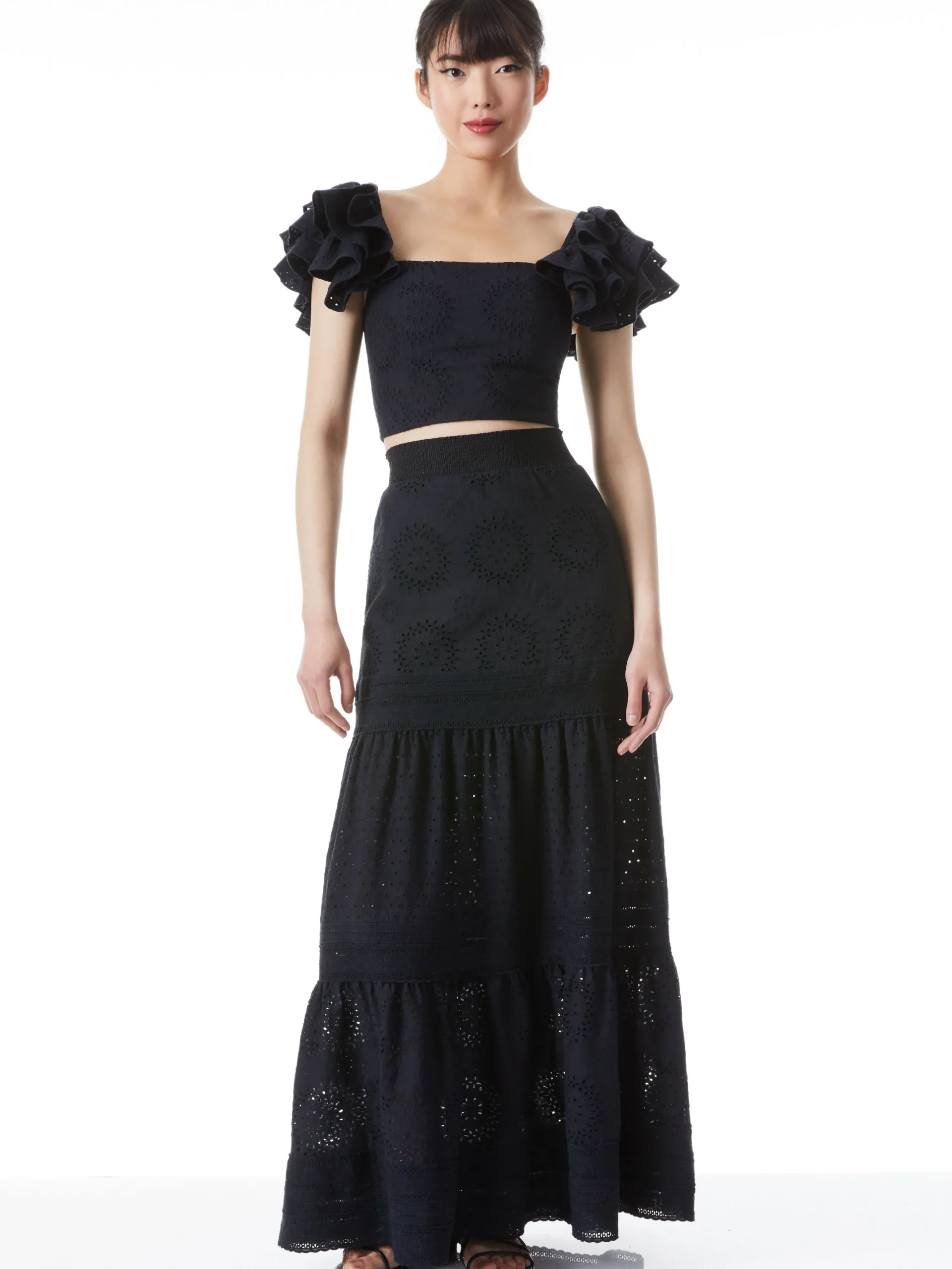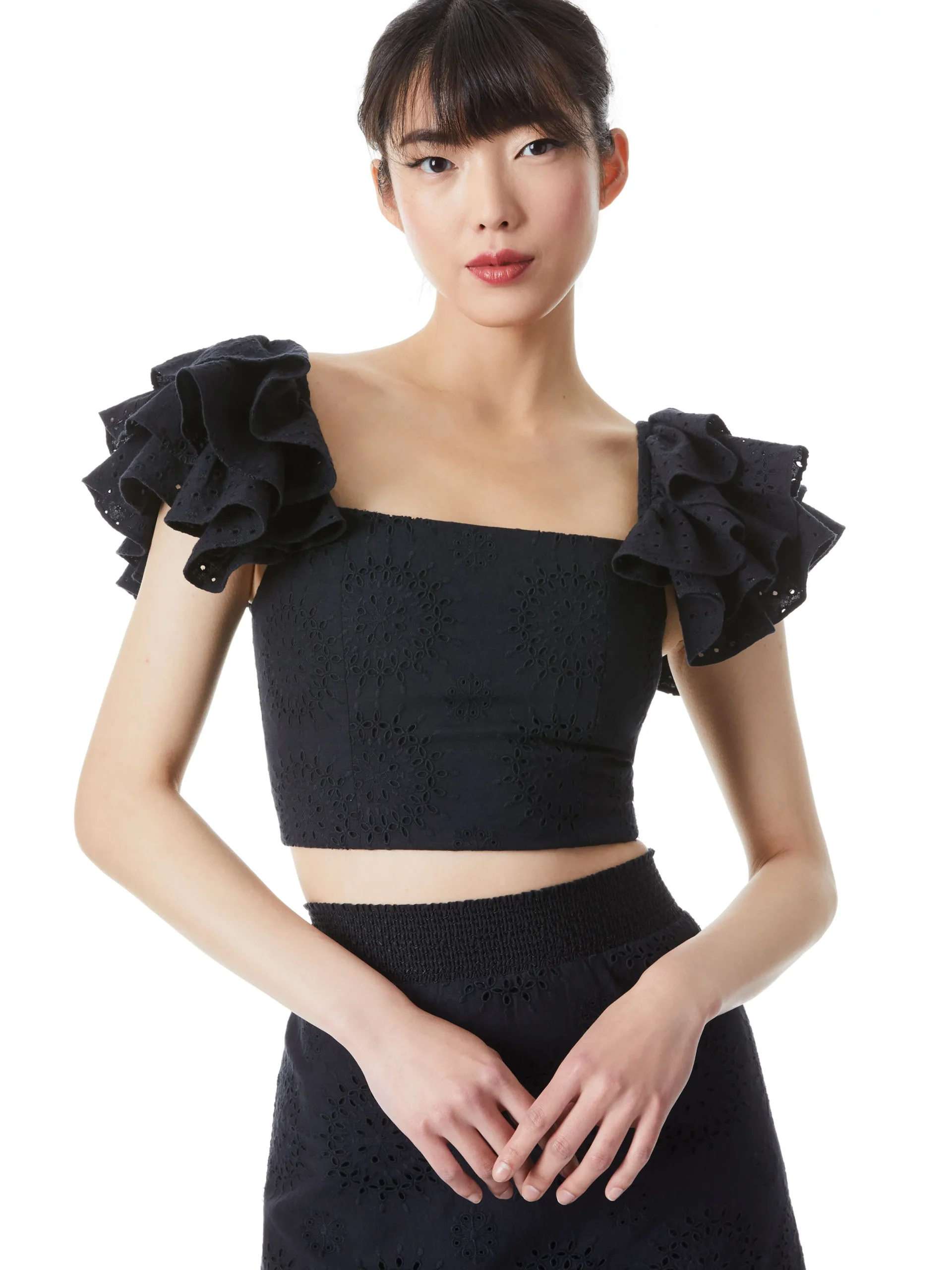 Alice and Olivia TAWNY EYELET SQUARE NECK RUFFLE CROP TOP BLACK*CLOTHING
