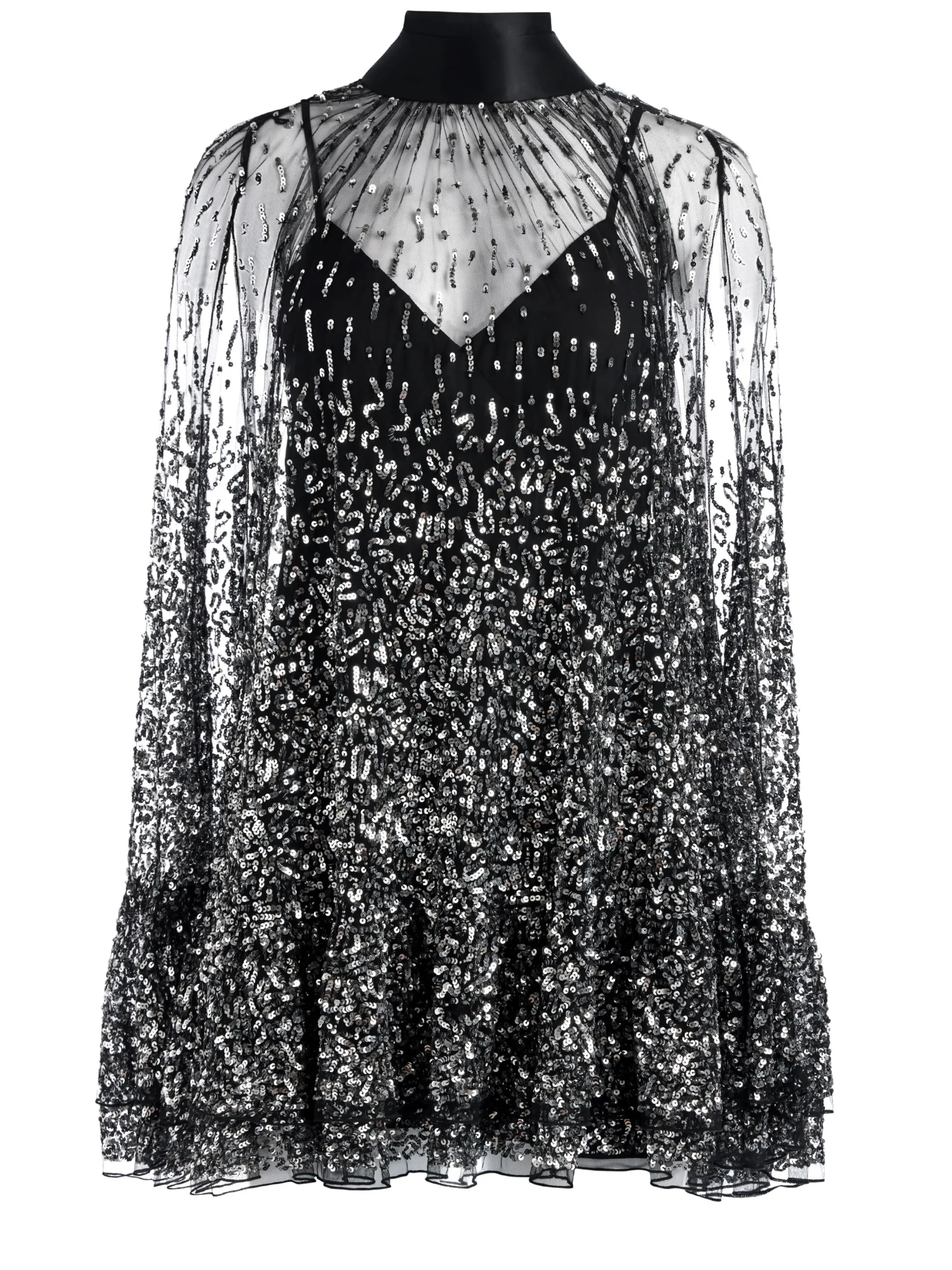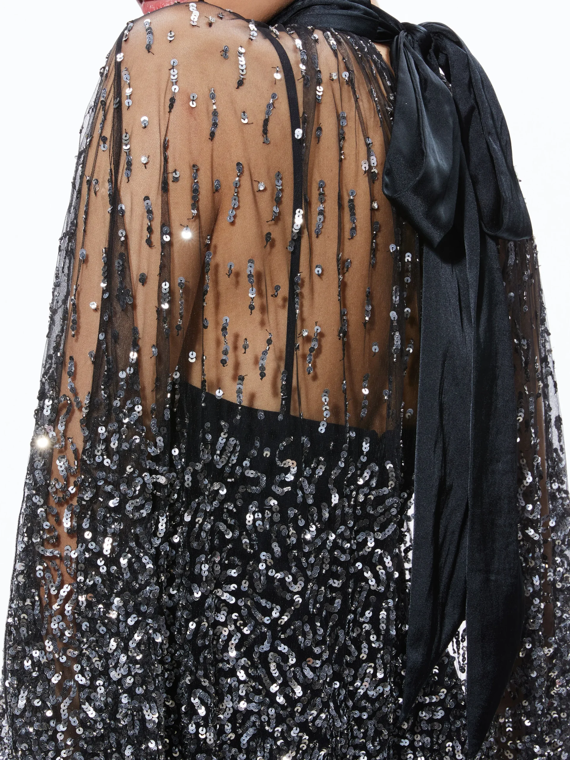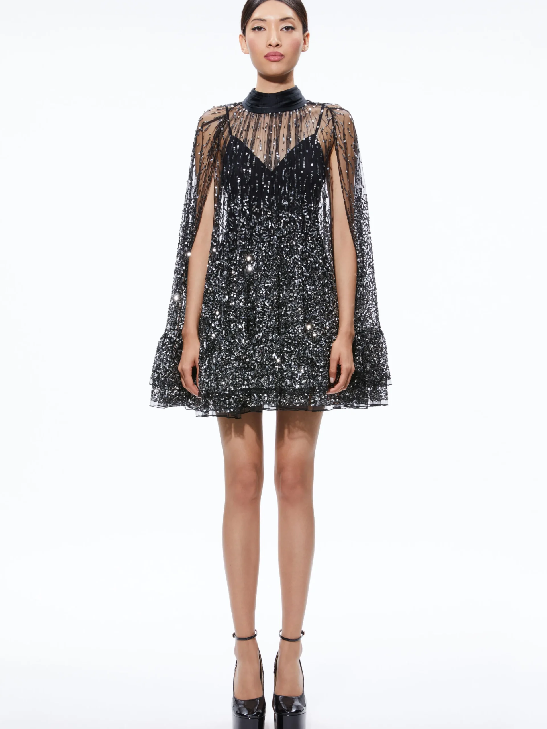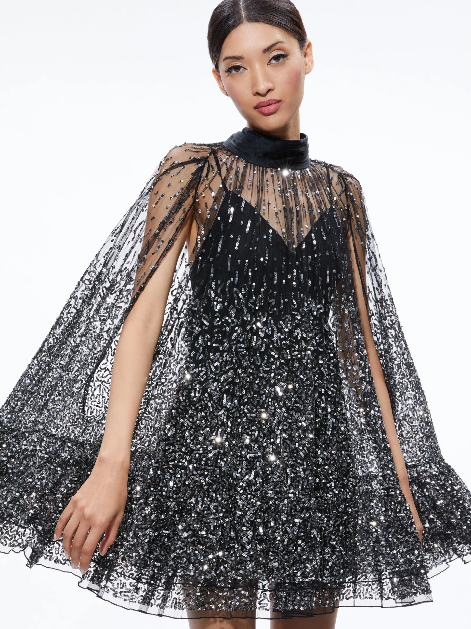 Alice and Olivia ZENON SEQUIN CAPE MINI DRESS BLACK/SILVER*DRESSES | DRESSES | CLOTHING
